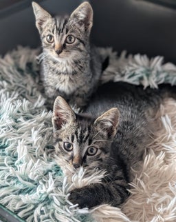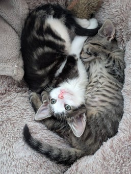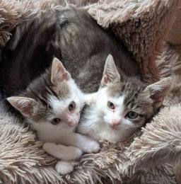 Deze poesjes zijn zonder moeder gevonden en met de fles grootgebracht. Ze zijn daardoor erg mensgericht. Ook zijn ze hondjes gewend. Het heeft de voorkeur, dat ze samen kunnen blijven, deze 2. Ze zijn al gechipt en geënt!